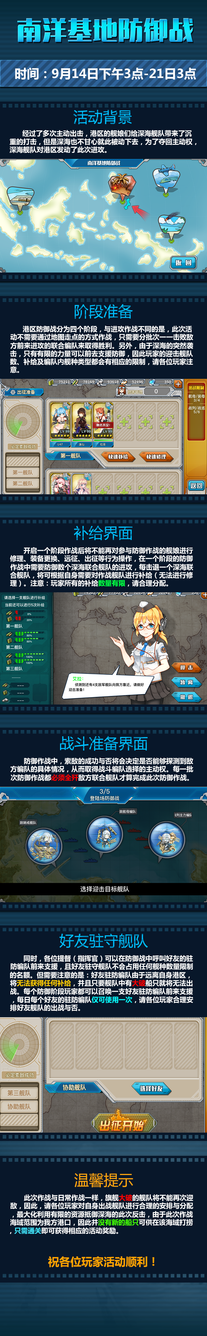 各位提督(指挥官),截获最新深海情报,深海反击即将开启,9月14日下午3时将开启活动“南洋基地防御战”,请做好准备。