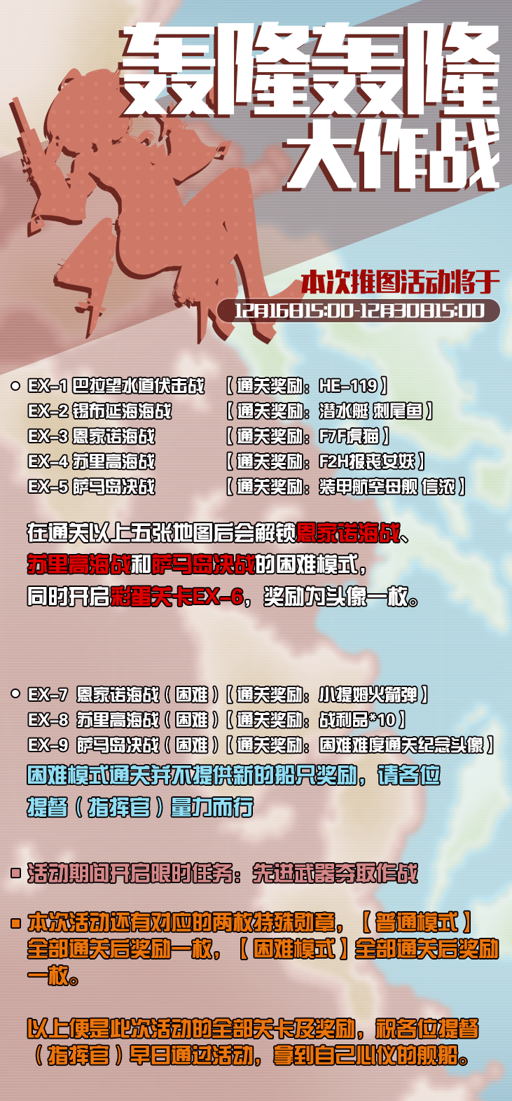 各位玩家,我们将于12月16日15:00-12月30日15:00开启新的作战计划:轰隆轰隆大作战。请各位玩家做好相关准备。
